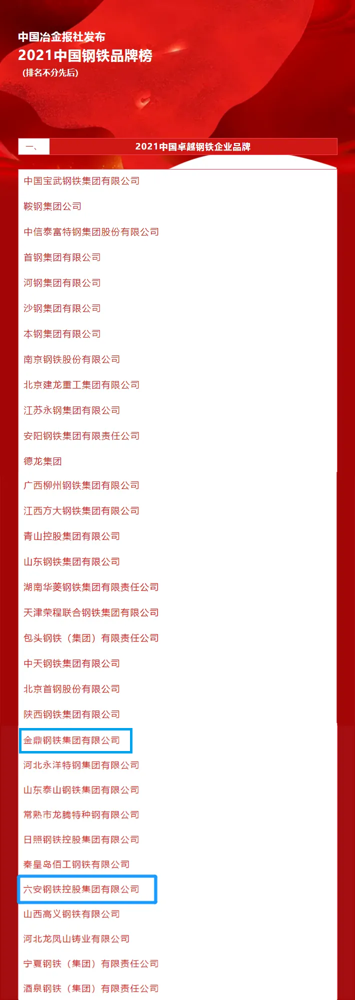 品牌是企業(yè)乃至國家綜合競爭力的重要體現(xiàn)。5月10日,第五個(gè)中國品牌日之際,中國冶金報(bào)社隆重發(fā)布2021年度中國鋼鐵品牌榜。方同舟控股下屬金鼎鋼鐵集團(tuán)、六安鋼鐵控股集團(tuán)雙雙榮膺“2021年度中國卓越鋼鐵企業(yè)品牌”榮譽(yù)稱號。
