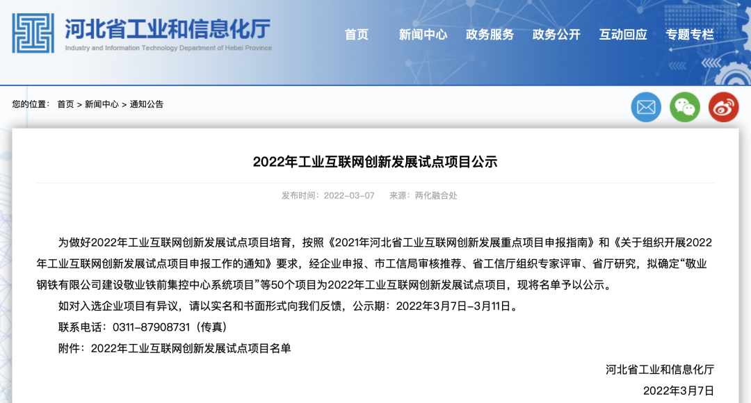 陽春三月,捷報(bào)頻傳。2022年3月,河北省工業(yè)和信息化廳發(fā)布公示50個(gè)項(xiàng)目為2022年工業(yè)互聯(lián)網(wǎng)創(chuàng)新發(fā)展試點(diǎn)項(xiàng)目,其中方同舟控股下屬子公司金鼎鋼鐵集團(tuán)《工業(yè)互聯(lián)網(wǎng)數(shù)智化平臺(tái)一期項(xiàng)目》獲此殊榮。