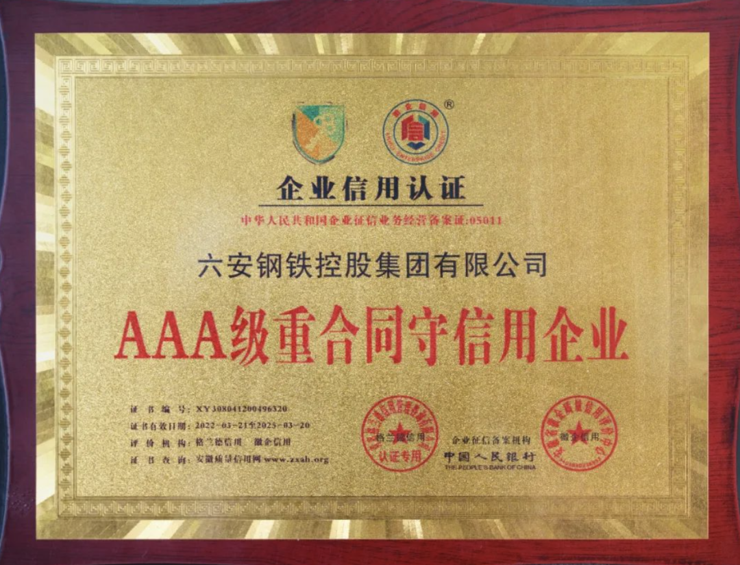 為落實(shí)黨中央、國務(wù)院關(guān)于加強(qiáng)社會(huì)信用體系建設(shè)的決策部署,加快構(gòu)建以信用為核心的新型市場監(jiān)管機(jī)制,按照國務(wù)院《社會(huì)信用體系建設(shè)規(guī)劃綱要(2014-2020年)》的總體要求和安徽省委、省政府《關(guān)于進(jìn)一步加強(qiáng)社會(huì)信用體系建設(shè)的意見》的要求,經(jīng)公司公共事務(wù)部申報(bào),六安鋼鐵控股集團(tuán)順利通過評(píng)價(jià)認(rèn)證,榮獲“AAA級(jí)重合同守信用企業(yè)”稱號(hào)。